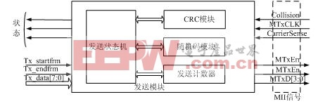 MAC发送模块可将上层协议提供的数据封装之后通过MII接口发送给PHY。发送模块可接收主机接口模块的数据帧开始和数据帧结束标志,并通过主机接口从外部存储器中读取要发送的数据,然后对数据进行封装,再通过PHY提供的载波侦听和冲突检测信号,在信道空闲时由MII接口将数据以4位的宽度发送给PHY芯片,最后由PHY将数据发送到网络上。