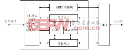 MAC控制模块则用于执行全双工模式中的流量控制功能。MAC状态模块可用来监视MAC操作过程的各种状态信息,并作修改。MII管理模块提供了标准的IEEE 802.3介质独立接口,可用于连接以太网的链路层与物理层。主机接口则提供以太网控制器与上层协议(如TCP/IP协议)之间的接口,以用于数据的发送、接收以及对控制器内各种寄存器(控制、状态和命令寄存器)的设置。