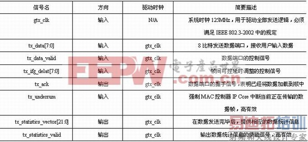 发送引擎通过客户发送端口接收以太网的数据帧,并在帧头添加帧引导区域,甚至在帧长小于最短要求时,添加一定的冗余比特。同时,该模块还会在连续的数据帧之间插入以太网协议所规定的最小延时,将用户数据转化成标准的GMII数据帧,并送至GMII模块。在应用时,面向用户的操作就是将用户数据读入GEMAC核内部