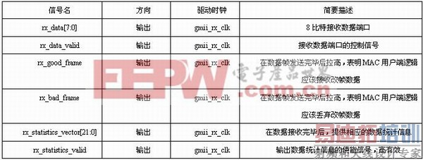 接收引擎接收来自GMII模块的数据,去掉帧头的引导区域,包括为了增加帧长的冗余比特。此外,该模块还能根据数据帧中的检验序列区域、接收到的GMII错误码字以及帧长信息完成错误检测,主要接口信号的简要说明如表10-11所列。