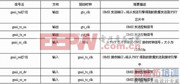 GMII模块的接收信号一般都是直接连到PHY芯片上,负责和PHY芯片的数据交互,其信号和PHY芯片的接口是一一对应的,如表10-15所列。