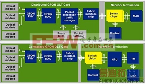 图2:OLT线路卡采用的分布式与集中式架构的比较