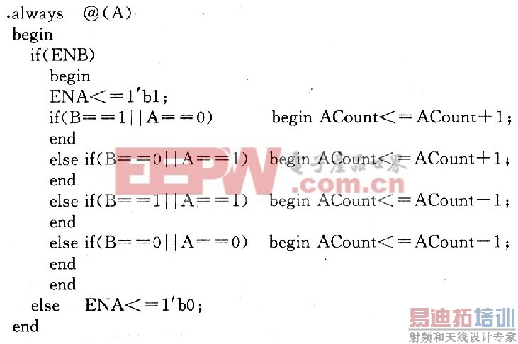 另一个模块BlockB主要完成的功能是滤除编码器B相的抖动脉冲。根据分析滤除编码器抖动的原理,ENA引脚为BlockA模块的输出引脚,当A相输入引脚有跳变时ENA为1,A相引脚有连续的跳变或者接下来B相有跳变时ENA为0。ENB为编码器B相跳变使能引脚,当ENA为1时如果B相有跳变ENB为1,当ENA为1时如果B相有连续跳变ENB为0。主要程序如下: