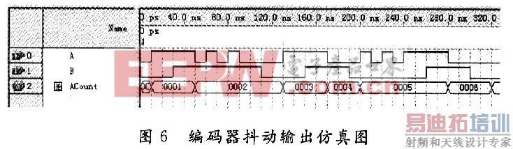 以图4(a)的编码器抖动输出仿真为例,仿真效果如图6所示。从图中分析,A相输出7个脉冲,应该输出3个脉冲,二倍频后是14个脉冲,应该输出6个脉冲,经过滤除后脉冲计数器数为6个。A相的抖动脉冲得到有效的滤除。