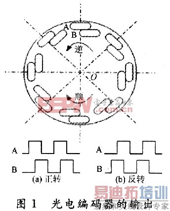 增量型编码器是一种通过光电转换将输出轴上的机械几何位移量转换成脉冲或数字量的传感器,它由光栅盘和光电检测装置组成。光栅盘是在一定直径的圆板上等分地开通若干个长方形孔,见图1。由于光电码盘与电动机同轴,电动机旋转时,光栅盘与电动机同速旋转,经发光二极管等电子元件组成的检测装置检测输出若干脉冲信号,编码盘上涂有两道相差90°黑自相同的栅栏,分别称之为A道和B道。其输出脉冲也是相差90°。当编码器正向旋转时,A相比B相超前90°,当编码器反向旋转时,A相比B相滞后90°。正常情况下编码器的输出波形如图1所示。