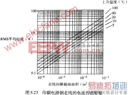 图5.23描述了最大的功率输送能力和温度上升的关系。在图5.23中,水平轴显示的是横截面面积,单位为IN的2次方,纵轴显示的是该线在给定升温值时的允许电流。