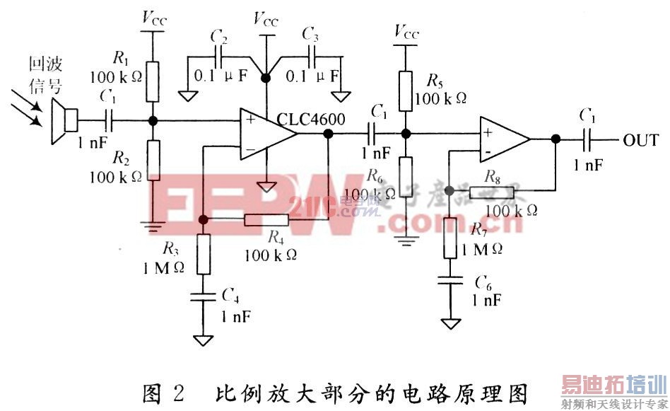 信号发送出去以后若遇障碍物就会反射回来,即为回波。回波信号信号一般较弱,仅为几毫伏,该系统先将接收到的回波进行比例放大,使回波信号增大到几百毫伏。比例放大部分采用的芯片是CADEKAMicrocircuits的CLC4600运算放大器,CLC4600运算放大器据具有四信道,每通道供电电流消耗仅3.3 mA,具有300MHz的单位增益带宽。比例放大部分的电路原理图如图2所示。