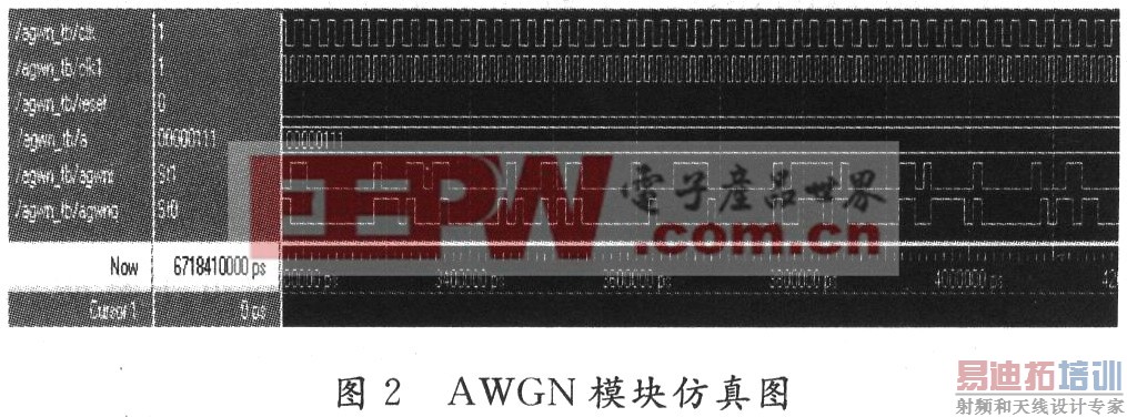 图2是对顶层模块(AGWN模块)进行功能仿真后在不同时段的波形。由图中可以看出,输出序列具有随机性。