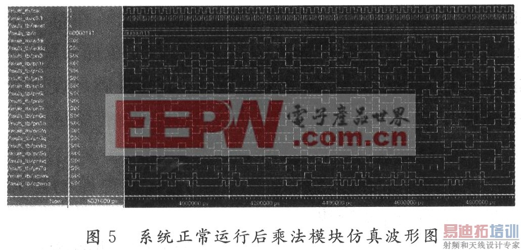 图5是系统正常运行后乘法模块的仿真波形。值得注意的是在系统刚开始运转时,reset信号之后,由于PN序列发生器和加法器中的串行输出数据,还没有传递到乘法器模块中的被乘数寄存器(multiregi/multi-regq)和乘积寄存器中,这时从乘积寄存器中串行输出一些不确定值。