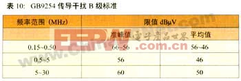当电气设备使用场合已确定时,该设备的emi标准就得按使用场合所在行业的emi标准来衡量。例如,某开关电源用在信息行业,则这个开关电源就作为信息设备,使用信息行业emi标准来诊断,即引用gb9254(相当于en5502)a或b级标准。对于gb9254传导干扰a和b级标准分别见表9和表10。使用表9与表10时,在过渡频率(0.5mhz) 处应采用较低的限值;使用表10时,在0.15mhz~0.50mhz频率范围内,限值随频率的对数呈线性减小。