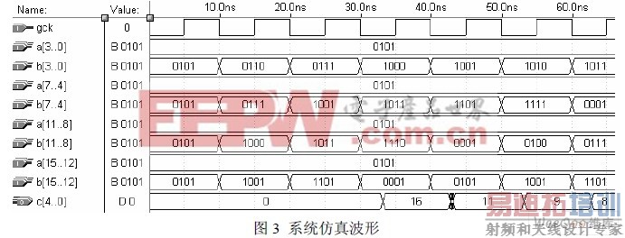 在 MAX+PLUSII环境下,根据高速数字相关器的原理图进行设计,这里将时钟端 gck设计为周期 10ns的时钟。a[15..0]端为帧同步字设置端,将其设置为 1、0交替码; b[15..0]端为码元输入端,输入连续的信号,其输入码元的周期也为 10ns ;c[4..0]作为记录信号,记录连续的输入码元与帧同步字相同的个数。然后对原理图进行编译、仿真,得到仿真波形如图 3所示。可以看出,从连续的 16个码元输入到同步检测输出经过 3个时钟周期,输出端 c[4..0]表示了连续的输入码元 b与帧同步字 a相同的个数,当 c[4..0]为 16时,表示 a和 b实现了同步。在对高速数字相关器进行编译、仿真成功后,对引脚进行锁定并将编程文件下载到 ALTERA公司 ACE1K系列芯片 EP1K30QC208进行实验验证,实验结果正确,表明设计是可行的。