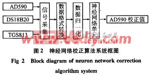本文采用三层前向网络,输入层神经元2个,分别代表温度传感器ADS90和气体传感器TGS813输入信号,DS18B20的测量值作为AD590的期望值,输出层神经元1个,代表AD590的校正值。