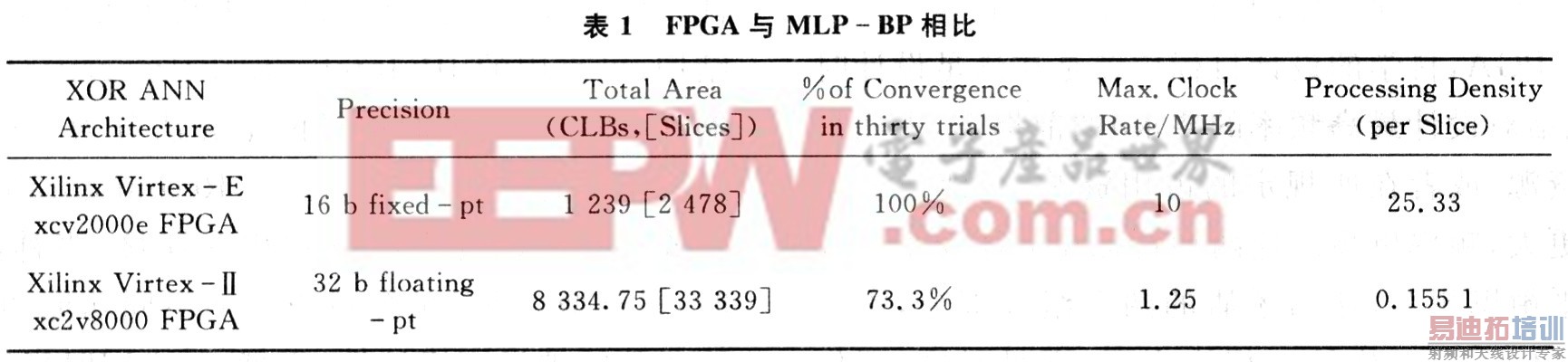 对于MLP-BP而言,Holt and Baker凭借仿真和理论分析指出16为定点(1位标志位,3位整数位和12位小数位)是最小可允许的精度表示(指可以达到收敛)。以逻辑XOR问题为例,文献[1]中表格2.5(见表1)表明与基于FPGA的MLP-BP浮点法实现相比,定点法实现在速度上高出12倍,面积上是浮点实现的1/13,而且有更高的处理密度。