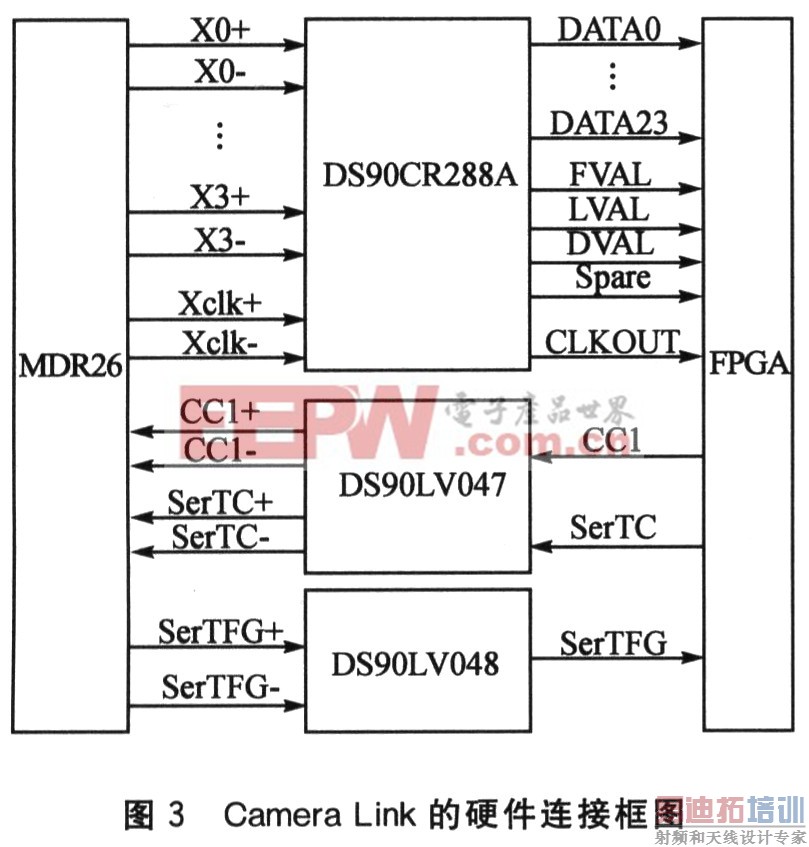 Camera Link的硬件连接框图如图3所示。硬件电路包括3部分:相机通过MDR26连接图像采集卡;CameraLink接口的LVDS信号和CMOS信号转换电路;FPGA接收相机数据和发送控制部分。