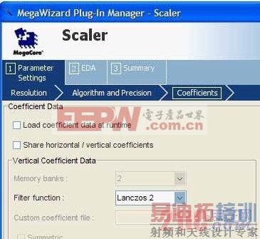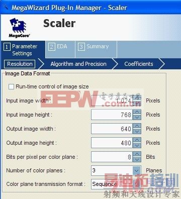 II 处理器上运行的软件计算并重新装入合适的系数,从而提高了图像质量。最后,在将视频流与背景测试码型以及第二个视频流混合之前,帧缓冲功能在外部存储器中缓冲视频数据。两路视频流输入到合成器进行缩放和同步,需要对突发数据流进行平滑处理。 第二个通道处理质量稍差,这样可以提高视频格式转换的资源利用率。主要有两种方法来处理两路不同格式的视频流: ■ 使用简单的最近邻居缩放算法对第二个视频流进行缩放,需要较少的片内存储器和乘法器资源。 ■ 使用场合并去隔行算法对第二个视频流进行去隔行处理,需要较少的逻辑资源和外部存储器带宽。 3 定制您的图像格式转换设计 Altera 视频工作台从根本上支持用户定制设计。工作台支持三级定制,非常灵活,如图4 所示。在FPGA 领域,这种定制功能是前所未有的,采用ASSP 进行设计是无法实现的。 图4. Altera 视频工作台支持不同层面的定制功能 采用Altera 视频工作台开发设计时,可以使用两种创新技术实时进行更新: ■ 数据包格式流接口——设计用于在功能模块之间同时传送视频和控制数据包。 ■ 算法功能模块配置——可以配置为存储器映射组件,通过写入相应的控制寄存器,实时更新功能。 Avalon-ST 视频协议是Altera 新的低开销流协议,提供面向数据包的方法来发送视频和控制数据。控制数据包用于发送动态参数,该参数描述流视频帧格式。这些参数应用于将要到达的下一视频数据包,或者在编译时设定,用在复位后接收到的第一个视频数据包上。( 表2 列出了控制数据包是怎样提供下一帧信息的)。数据到达时,视频数据流中的嵌入式控制数据包支持采用新数据对视频处理流水线进行重新配置。 表2. 控制数据包支持对视频流格式的动态更新 除了通过流接口实现运行时更新, Altera 开发的大部分视频功能模块都具有运行时更新功能。这表明,这些模块使用存储器映射从机接口,支持对状态机和片内处理器的更新。每个从机接口支持对一组控制寄存器的访问。例如,可以使用片内处理器,在运行时更新这些控制寄存器。在新一帧的开始,更新后的控制数据被装入到IP 功能模块中。这样,您可以在系统运行时更新图像大小和缩放系数,改变缩放比。图5 显示了Altera 视频工作台多相缩放引擎是怎样实现运行时控制的。 图5. 更新缩放功能 为进一步定制设计,您可以针对MegaCore 功能来修改参数。Altera 开发的所有视频功能都是可以进行参数赋值的。如图6 所示,利用去隔行器功能,您不但可以选择去隔行算法,还可以选择默认场、直通模式、外部存储器缓冲帧数量、输出帧速率和运动控制补偿等算法。