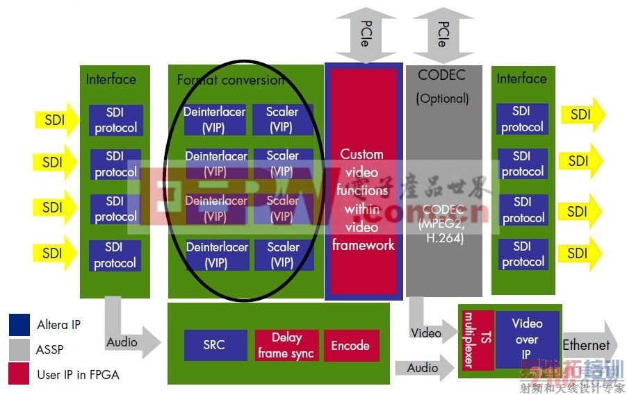 服务器、交换机、前端编码器以及专用演播显示器等广播基础设备系统支持各种输入图像格式,在存储、编码和显示之前,通常需要将图像转换为高清晰(HD) 或者其他分辨率格式。专用ASSP 虽然满足了这一市场需求,取得了一定的成功,但仍然面临通过采用单芯片方案来满足广播设备供应商各种特殊需求这一挑战。例如,在交换机应用中,总延时非常重要,延时是显示和视频会议系统的关键因素,而图像质量是摄制后期设备最重要的指标。除了这些特殊应用需求,器件还必须能够支持各种帧速率、分辨率和格式。
