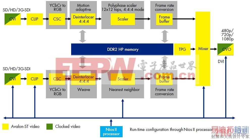 然后,将视频传送至去隔行功能模块。由于运动自适应算法要求输入颜色通道具有相同的采样率,因此,在进行去隔行处理之前,先进行色度上采样。( 今后的去隔行IP 将支持4:2:2 模式的视频处理功能)。去隔行器经过配置后,能够同时接收逐行和隔行视频。当输入视频是隔行格式时,运动自适应算法产生逐行格式的视频流。当输入视频是逐行格式时,去隔行器直接输出数据,不对其进行处理。当进行运动自适应去隔行处理时,数据在外部存储器中进行缓冲,完成基本帧速率转换处理。 然后,通过参数赋值缩放器功能( 具有12 个横向和12 个纵向抽头) 的多相算法对逐行视频流进行缩放。 采用Avalon 存储器映射(Avalon-MM) 从机控制接口对缩放器进行配置,支持缩放器输出分辨率运行时规范要求。此外,当缩放比率变化时, Nios