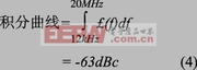 如前所述,抖动和相位噪声所描述的是同一现象的特征,因此,如果能从相位噪声的测量结果中导出抖动的值将是有意义的。以下介绍推导方法:每个振荡器都有其相位噪声图,图4给出一个例子。该图中绘出的是从12 kHz到 10 MHz这个频带范围内,某振荡器的相位噪声情况。图中,L(f)以功率谱密度函数的形式给出了边带噪声的分布,单位为dBc。中心频率的功率并不重要,因为抖动只反映了相位噪声(即调制)与“纯”中心频率处的相对功率值。边带的总噪声功率可以由L(f)函数在整个感兴趣频段内(在本例中,即12 KHz到 10 MHz频段内)积分得到。