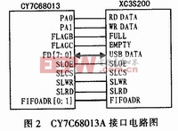 USB是一种支持即插即用及热插拔的串行总线,它具有传输速率高、连接灵活、使用方便等优点。CYPRESS公司的EZ-USB芯片CY7C68013A支持USB2.0协议,通信可靠,传输速率可达480 Mb/s。CY7C68013A工作在SLAVE FIF0异步通信方式下,接口电路如图2所示。