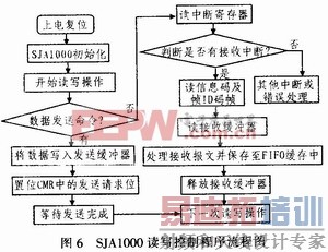 FPGA对SJA1000控制程序包括SJA1000初始化、SJA1000读数据、SJA1000写数据等部分。SJA1000的初始化是在复位模式下进行的,在复位模式下分别设置时钟分频器CDR、总线定时器(BTR0、BTR1)、输出控制寄存器(OCR)等重要寄存器。SJA1000通信波特率由总线定时器决定,需要与后端节点的波特率相同才能进行节点间的正常通信。FPGA上电后需要延时一段时间.等待SJA1000复位完成才能进行SJA1000初始化。初始化仿真波形如图5(a)所示。SJA1000内部有一个接收缓冲器和一个发送缓冲器。FPGA对SJA1000的读写操作,实际上对这两个缓冲器的读写控制。当FPGA接收CAN总线数据时首先读取SJA1000中断寄存器IR判断是否有接收中断。如果有接收中断到来则开始读取缓冲器内的8字节数据,然后释放接收缓冲器(写命令寄存器CMR)。使用Xilinx公司的Chipseope软件进行板上测试,测试数据为(E0,E1,……E7),抓取到的波形如图5(b)所示。FPGA读写SJA1000的流程控制图如图6所示。