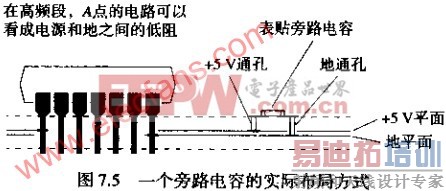 旁路电容的目的是在高频段把两个电源平面短路在一起。在图7.5中,如果假设一个集成电路在A点连接在电源和地平面之间,在B点有一个理想的表面贴装旁路电容。则预期在芯片焊接点的VCS和地平面之间的高频阻抗为零。然而,实际情况并非如此。将电容连接到VCC和地平面的每个连接通孔电感引入了一个小的但是可测量到的电感。这个电感的大小近似为: