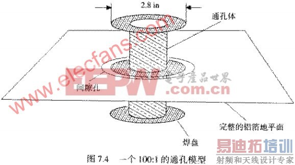 举例来说,图7.4表示了一个简单的焊盘模型,由铝箔和硬纸板构成,这是一个表面贴装设计走线通孔的100:1比例模型。中央的管子表示电镀孔的内表面。直径是1.6IN。管子两端的爆盘的直径是2.8IN。与地平面之间的间隙为5.0IN。从这些尺寸测算的电容值结果为11.0PF,按比例缩小100,在空气中的实际电容是0.11PF。由于实际的电容将会嵌入在FR-4中,其相对导磁率真为4.7,所以该通孔的电容将接近0.5PF。