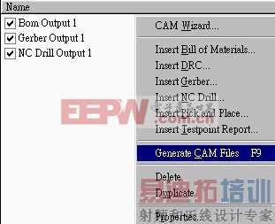 当我们都设定好GERBER及DRILL的格式后,人们就可以将其输出,按下滑鼠右键,选择Generate CAM Files,程式就会依据我们的设定,输出档案,存在档案夹 CAM for demo 中
