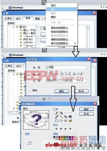 二、可以自定义工具按钮,比方说使用都经常使用切、切、切画圆的命令,但是使用命令操作起来比较麻烦,如果有个工具快捷按钮的话,会是很方便的,这就要用得到插入工具按钮的功能了,此功能的前提是必须打开定制功能窗口,然后右击新工具栏点击插入后,填写相关的命令信息,这时便可以利用菜单选项下画圆中的三切圆的详细信息粘贴进去;一个默认的铵钮图像会显示在新工具栏中,下一步便可以在编辑器中编辑按钮图像了。最后三切画圆的快捷按钮定制OK。