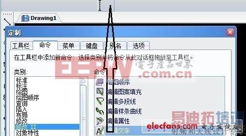 一、在上图中的工具栏选项卡中,可以将自己需要放在绘图桌面的工具栏勾选即可。有些使用者认为一个工具栏里面只用到个别的按钮功能,无需将那么长的工具条调出来,占用过多的绘图区域,所以这里提供了新建工具栏,可以利用命令选项卡中找到个别需要的工具按钮,按住鼠标左键拖拽工具按钮,如下图操作,将编辑文字按钮拖拽至箭头所指的新工具栏处。
