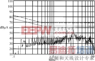根据国标的规定和激光器为一类电磁兼容性的设备应有的6dB的安全系数。标准值在图中用实折线标出,而虚折线为无安全系数的标准值。测试结果如下: