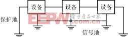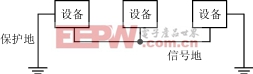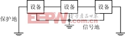 指电子设备中信号电路先参考于一点,然后把该点接至设施的接大地系统,如图2所示。其优点是简单实用,地线上其它部分的电流不会耦合进电路。缺点是需要大量导体,成本较高,而且随着频率升高,接地阻抗将增大,致使接地不理想。