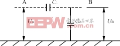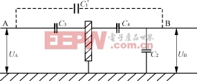 电子设备中所涉及的电场一般均是交变电场,这样,可把电位不同的两个单元间的电场感应看作是两者间分布电容的耦合,如图5所示。图中干扰源A的电位为UA,受感物B上的感应电压为UB,由图5可知:
