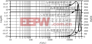 从图3可以看到,两种滤波电路(单级和双级)的等效串联电感量(Ls)和电阻值(Rs)随频率变化的曲线。电感量大的单级滤波器的自振频率在26MHz,电感量小的双级滤波器在40MHz以上时还具有电感特性。或者说电感量小的双级滤波器,其工作频率范围较宽。