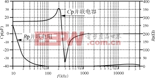 图4显示了电容器有关数值与频率的关系曲线,即等效并联电容(Cp)和等效并联电阻(Rp)随频率变化的曲线。可以看到,电容器与其引线电感发生谐振的频率大约在250kHz。