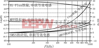 另外一个需要重点考虑的因素是,电感量会随频率变化而变化。图12,图13和图14所示的是,三种不同磁粉芯材料(MPP,HF和SUPERMSS)绕制的电感器(采用单层绕线,电感量为60μH),它们各自的等效电感、等效串联电阻、等效阻抗与频率的关系曲线。
