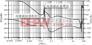 图6增益和相位与频率的关系曲线(对双级滤波器电路)