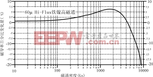 在工频下,要求磁芯损耗低,以便充分发挥磁芯材料的高饱和磁通密度性能。图10是对高磁通铁镍50HF磁粉芯测试结果而绘制的曲线。由于高磁通铁镍50HF磁粉芯有高的损耗,所以可以用在工作条件最恶劣的情况。在400Hz,9000Gs磁通密度下,它的磁芯损耗为200mW/cm3。在50Hz或60Hz下工作,磁通密度的使用上限要根据磁芯磁导率变化的大小确定,具体可参见图11。