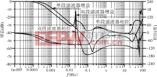图7复合增益和相位与频率关系曲线(对单级和双级滤波器)