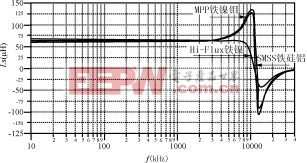 从图12可看到,高磁通铁镍HF磁粉芯的等效串联电感值随频率增加而跌落,这是由于其磁导率下