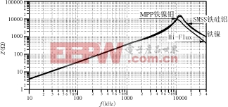 三种磁粉芯材料(铁镍钼MPP,铁镍HF和铁硅铝SUPERMSS)最适合用于差模滤波器中的电感(有时这种电感也称之为“串模电感”或“扼流圈”)。原因是这三种磁粉芯材料在偏磁场下具有极好的电感量保持能力。铁镍50%HF高磁通磁粉芯(美国阿诺公司注册商标Hi-FluxTM),特别适合用于高磁通密度工作条件。为了便于比较,图9标明了三种不同材料磁粉芯在直流偏磁场下的磁导率变化曲线。