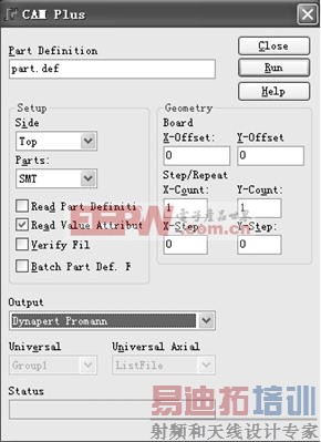 4)输出坐标数据。选择菜单“File→CAM”,弹出如图 1 所示界面,在 Side 栏中选择 PCB 顶层或底层(Top or Bottom),Parts 栏中选择 SMT,Output 中选择输出贴片机格式, 这里选择 Dynapert Promann,然后点击“Run”按钮,在弹出的提示文件存盘路径的对话框 中点击确认键,坐标数据导出。