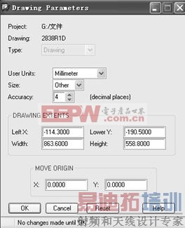 2) 设定原点和切换公制单位。选择菜单“Setup → Drawing Size…”,弹出如图 3 所示对话框,用户单位选择 millimeter,MOVE ORIGIN 栏中输入新原点位置相对于当前原点的坐标数据,然后按“OK”确定。