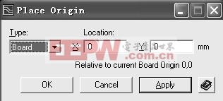 3)设定原点。选择菜单“Edit → Place → origin…”,在弹出的对话框中 Type 类型选择为Board(如图 6),Location 栏中输入新原点位置相对于当前原点的坐标数据。
