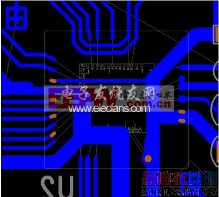 2、基板的制作工艺特殊,每条线都必须是由电镀线采用电镀的手法将铜材质浇筑以至形成焊盘和走线,或者其它一切的需要用到铜的地方。这里必须注意到,就算是没有电气连接即没有网络的焊盘,都必须在eco模式下,将焊盘拉出板框外来将该焊盘镀铜,否则将出现该焊盘无铜的结果。且拉出板框的电镀线必须有一个在其它层的铜皮标识出其腐蚀的位置,这里用第七层的铜皮标识。一般而言,该铜皮超越板框靠里0.15mm,而铺铜的边缘距离板框约为0.2mm距离。