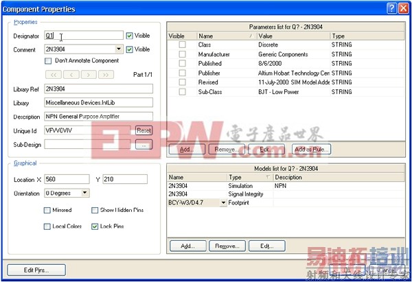 7、在对话框 Properties 单元,在 Designator 栏中键入Q1以将其值作为第一个元件序号。