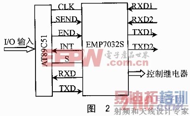 图3中:CLK为同步时钟;SEND为数据接收;END为SEND信号的控制端;S为位选端,用业控制串行通信端口选择;RXD、TDX为单片机和EPM7032之间的串行通信端口;RXD1、TXD1、RXD2、TDX2为串行通信扩展口。这种方案,已经过多次检验,对于节省PCB板的面积和布线难度、提高设计可靠性和提高设计效率都非常有帮助。