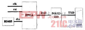 本方案的异步串行通信的硬件接口电路图如图1所示,主要由四部分组成:RS-485数据发送模块、FPGA串口模块、MAX3223和DB9。各部分功能简述如下: