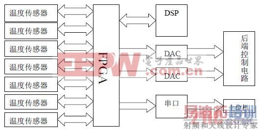 温控电路的整体结构框图如图1 所示。其中包括七路温度传感器,DSP, 232 接口芯片,DAC ,后端控制电路,上位机和FPGA 等多个组成部分。FPGA 接口是整个电路的核心。
