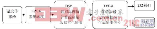 FPGA 与外围电路之间的通信接口主要包括与温度传感器,DSP,232 接口芯片和DAC的通信接口四个部分。