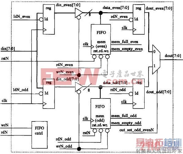 本文介绍的32X8FIFO设计采用了双体存储器(FIFOMemory)结构(如图2)。每个FIFOMemery中都有一个16X8的RAM,rd-cntr3: 和wr-cntr3: 分别作为读、写地址,rd-cntr和wr-cntr分别作为读、写状态位。对整个系统,当写信号(wrN)有效,数据将写入FIFO,且交替写入这两个分立的存储器。当读信号(rdN)有效,数据将被读出FIFO,且交替从这两个分立的存储器读出。对基于单体存储器的FIFO,在读操作的同时不能有任何的写操作,只能在读操作结束后再进行写操作。本文应用的交替读写机制使得32X8 FIFO具有可以同时读写的能力,即对一个存储器读操作的同时可以对另一个存储器写操作;对一个存储器写操作的同时可以对另一个存储器读操作。32X8 FIFO Data Path的结构框图如图3所示。其结构中有两个分立的存储器FIFOmem(even)和FIFOmem(odd)。FIFO cntrl模块控制对这两个分立存储器的读、写操作。而整个系统的空、满标志位分别由FIFOmem(even)和FIFOmem(odd)中的空、满标志位mem_full_even、mem_empty_even、mem_full_odd和mem_empty_odd来实现。其中rdN和wrN为整个系统的读写控制信号,rstN为FIFO复位信号。同时可以看出32X8 FIFO共有3个周期的延时:输入寄存器,FIFOMemery和输出寄存器延时,存取速度快。